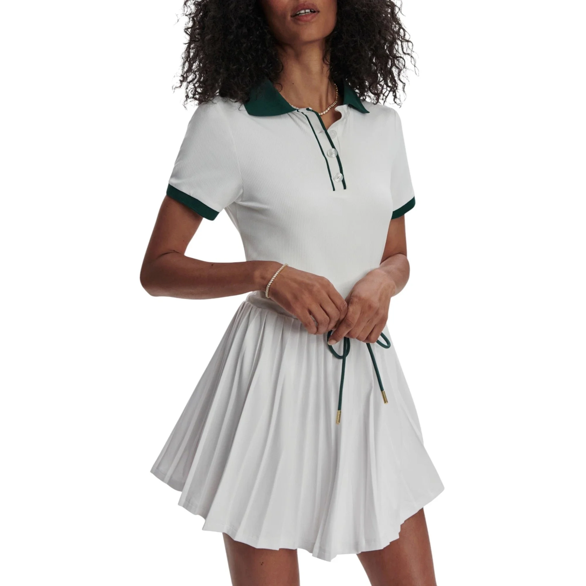 Here is another Golf Galaxy find that I think is extremely adorable! This gives a casual, yet stylish and athletic golf dress vibe. It could even transition to activities off the course, and who doesn’t love a two-in-one! This Paloma dress has a drawcord waist that slims your appearance accentuating the waist — especially with a looser, more flow skirt. The short sleeve offers some shoulder coverage from the sun while still giving the traditional golf polo style with the collar. It also comes with removable shorts.